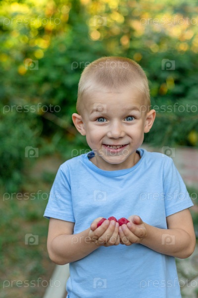 Счастливый ребенок держит только что сорванную малину. Глядя в камеру