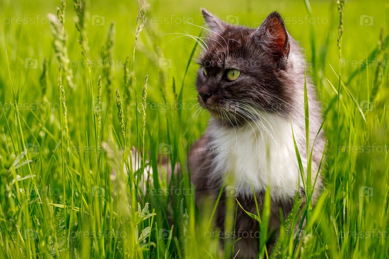 Пушистый кот сидит в траве в солнечный летний день
