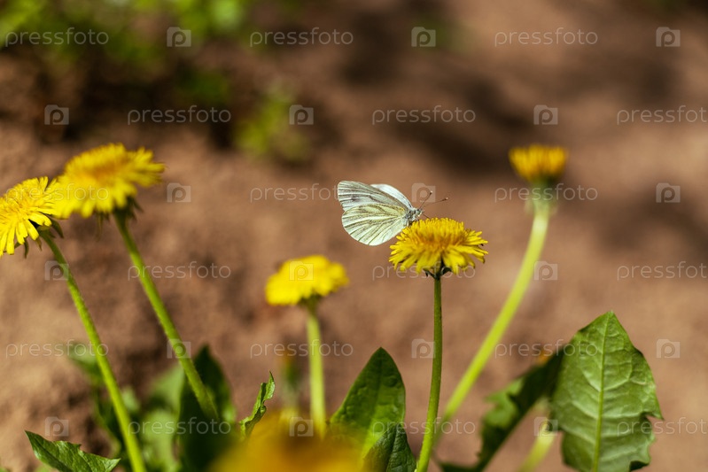 Белая бабочка сидит на одуванчике. Копировать пространство