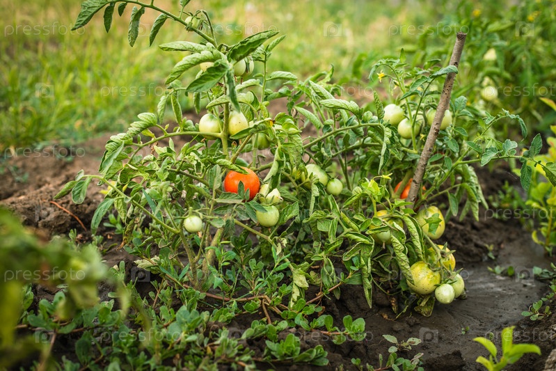 Один красный помидор среди зеленых в саду. Огород и сельское хозяйство
