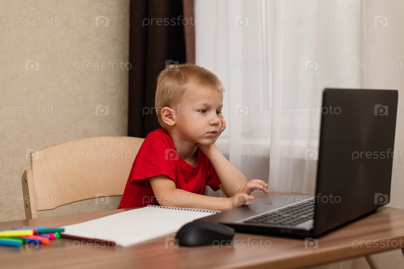 Онлайн дистанционное обучение. Ребенок внимательно смотрит на ноутбук и изучает урок рисования онлайн в Интернете. Онлайн школа