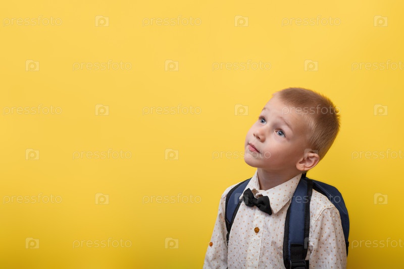 Обратно в школу. Блондин с рюкзаком в светлой рубашке на желтом фоне смотрит вверх. Образование. Баннер
