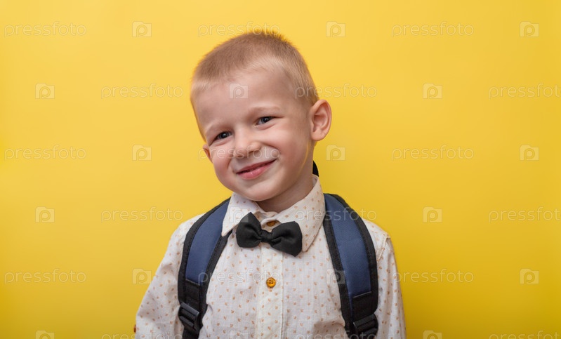 Обратно в школу. Блондин забавный мальчик с рюкзаком в светлой рубашке на желтом фоне улыбается и смотрит в камеру