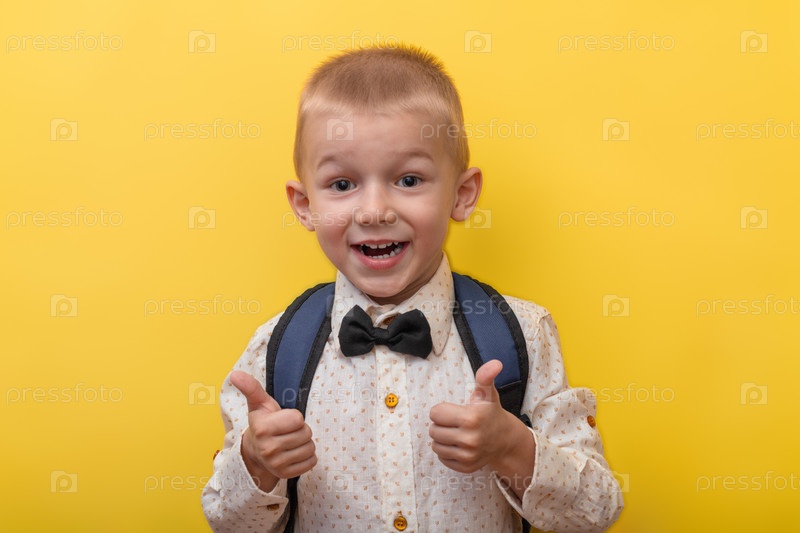 Обратно в школу. Блондин забавный мальчик с рюкзаком в светлой рубашке на желтом фоне показывает супер, класс и улыбается. Образование