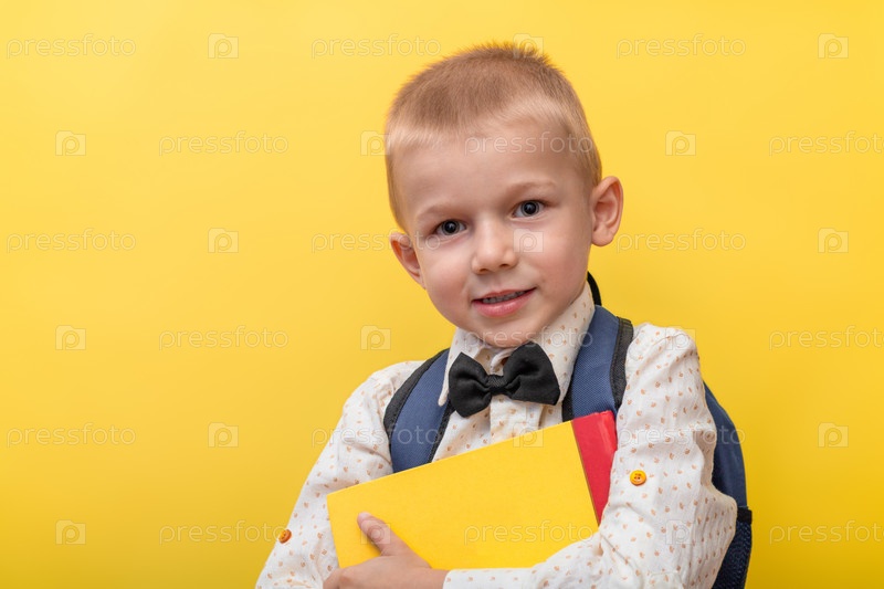 Обратно в школу. Блондин забавный мальчик с рюкзаком в светлой рубашке на желтом фоне держит книги в руках и смотрит в камеру