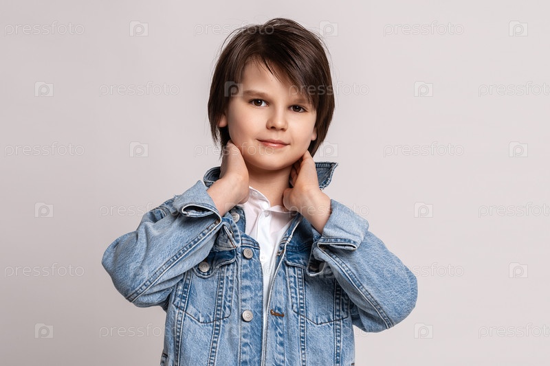 Красивый модный маленький мальчик в джинсовой куртке позирует в студии. Модельный тест. Концепция моды и людей