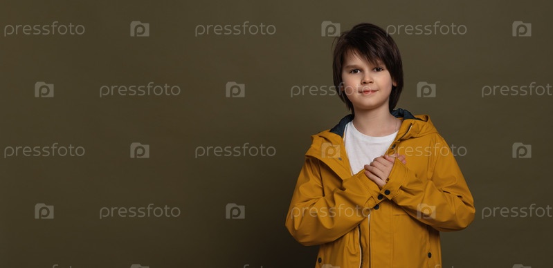 Спокойный маленький мальчик, держа руки на груди близко к сердцу, испытывает благодарность, благодаря судьбу. Концепция благодарности
