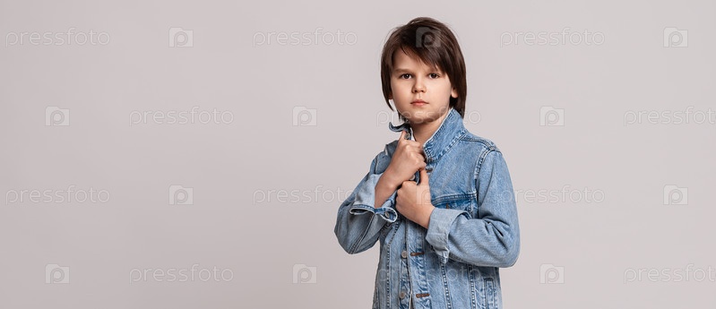 Красивый модный маленький мальчик в джинсовой куртке позирует в студии. Модельный тест. Концепция моды и людей