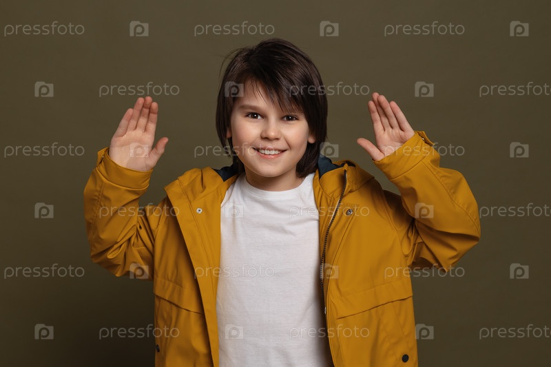 Эмоциональный маленький мальчик выражает радость и удивление, разводит руки в стороны и улыбается, показывая удивление и шок