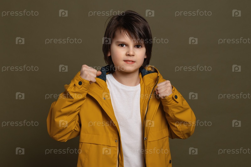 Агрессивный маленький мальчик трясет кулаками и смотрит в камеру, одетый в повседневную одежду, изолированный на зеленом фоне
