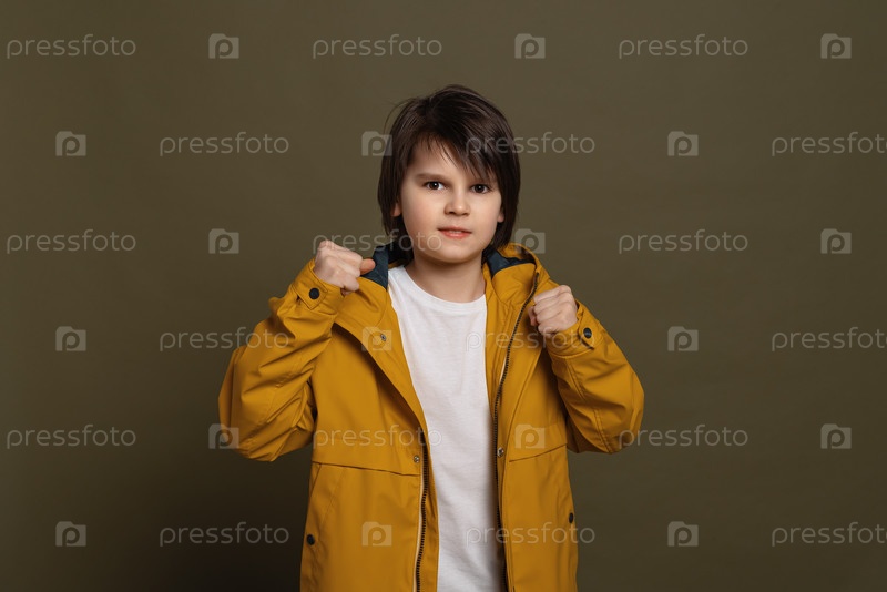 Агрессивный маленький мальчик трясет кулаками и смотрит в камеру, одетый в повседневную одежду, изолированный на зеленом фоне