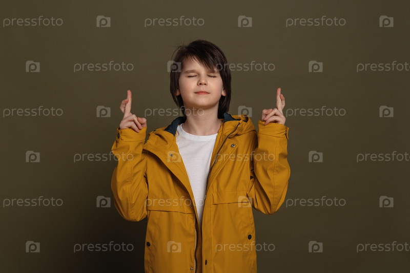 Портрет мечтательного маленького мальчика, держащего пальцы скрещенными и закрытыми глазами, стоя в изоляции на зеленом фоне