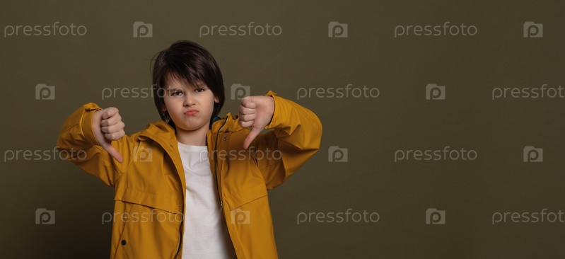 Портрет маленького мальчика, показывающего большие пальцы вниз и выражающего неприязнь, неприятие концепции. Студийный снимок, зеленый фон