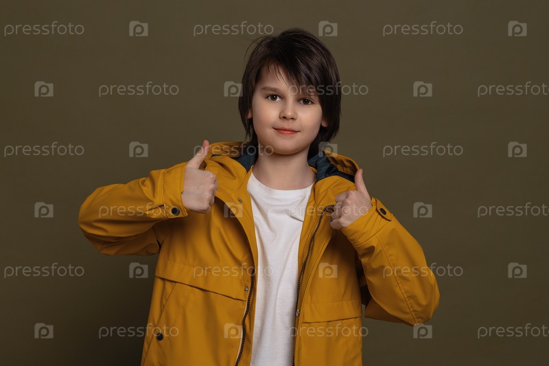 Счастливый маленький мальчик показывает палец вверх. Веселое выражение лица и жест победителя. Студийный снимок, зеленый фон