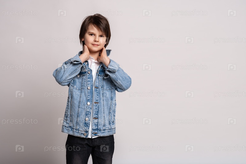 Красивый модный маленький мальчик в джинсовой куртке позирует в студии. Модельный тест. Концепция моды и людей