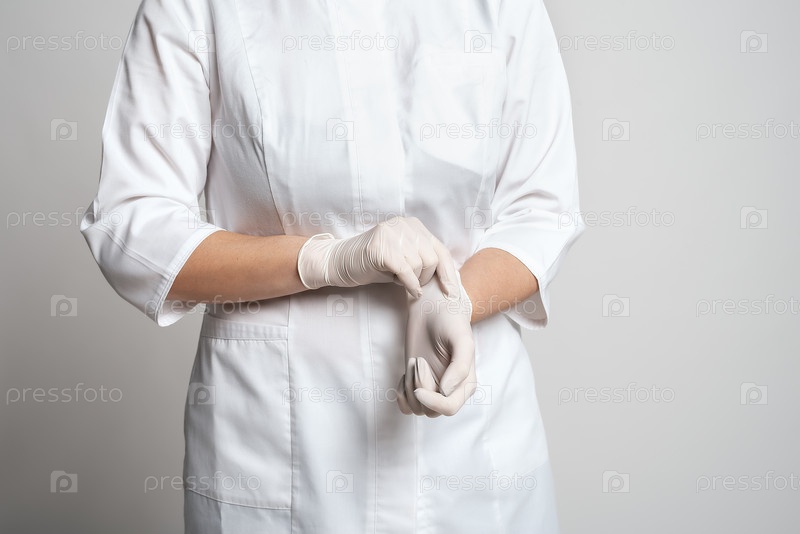 Обрезанный вид врача, надевающего белые латексные перчатки для защиты от вируса. Концепция медицины и здравоохранения