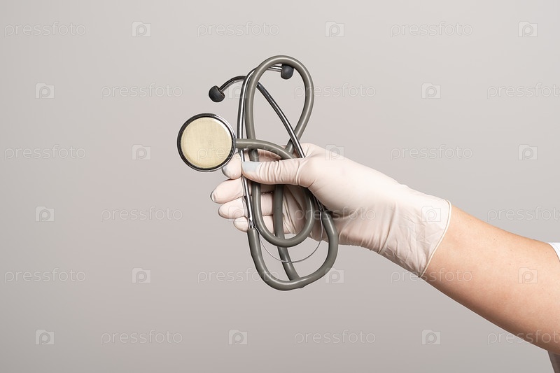 Крупный план руки в белой стерильной перчатке со стетоскопом, изолированный на сером фоне