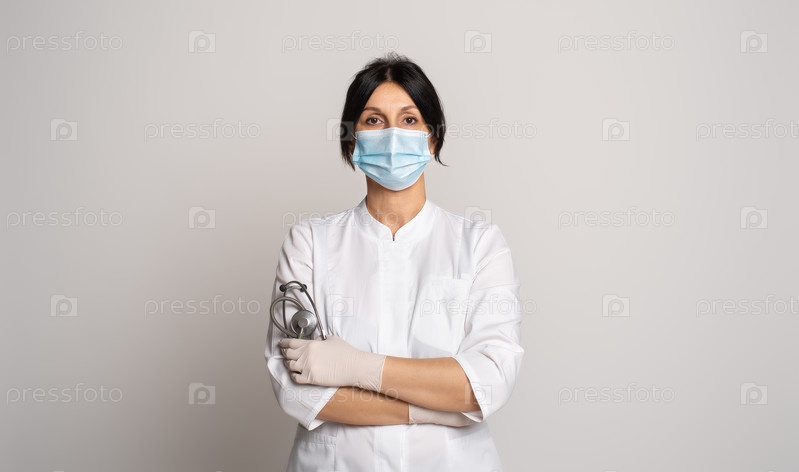 Женщина-врач или ученый в защитной маске для лица стоит со скрещенными руками на сером фоне