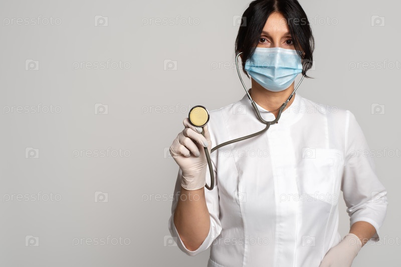 Женщина-врач в защитной маске для лица держит стетоскоп для аускультации. Селективный фокус на стетоскоп