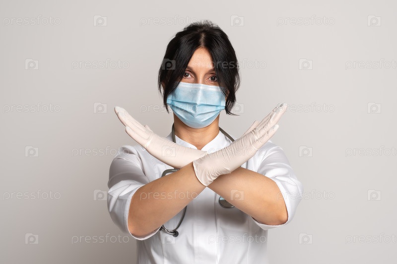 Серьезная женщина-врач или ученый в защитной маске для лица держит две руки скрещенными, делает жест остановки или запрета