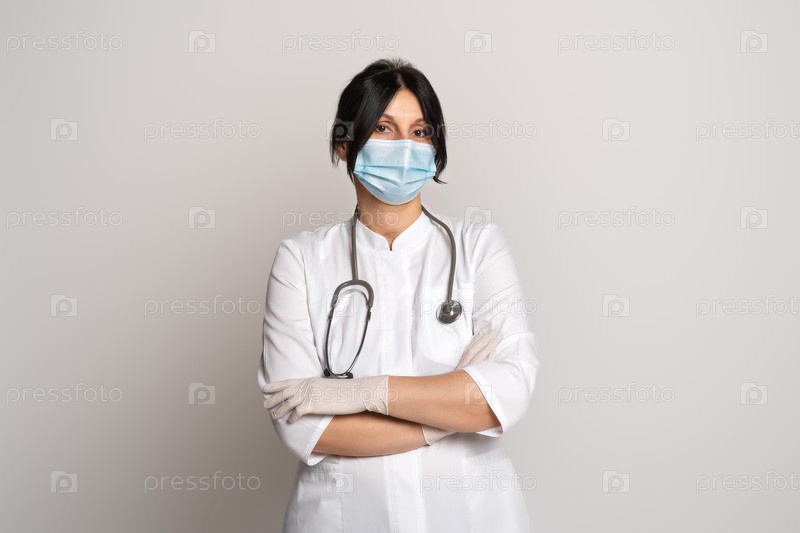 Женщина-врач или ученый в защитной маске для лица стоит со скрещенными руками на сером фоне