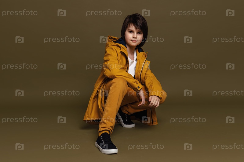 Портрет мальчика, позирующего в студии на зеленом фоне. Повседневный стиль. Стильная съемка в студии