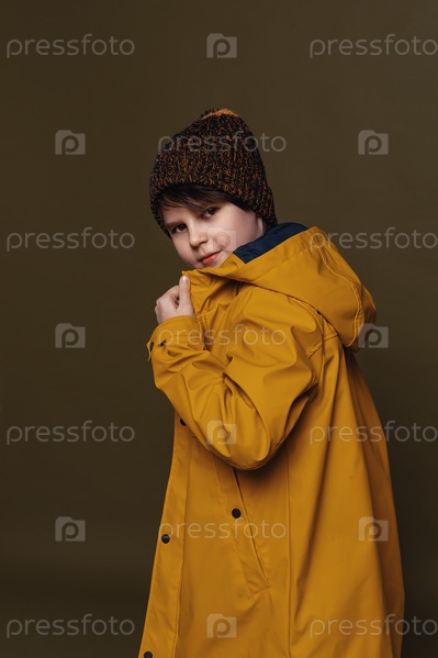 Портрет мальчика, позирующего в студии на зеленом фоне. Повседневный стиль. Стильная съемка в студии