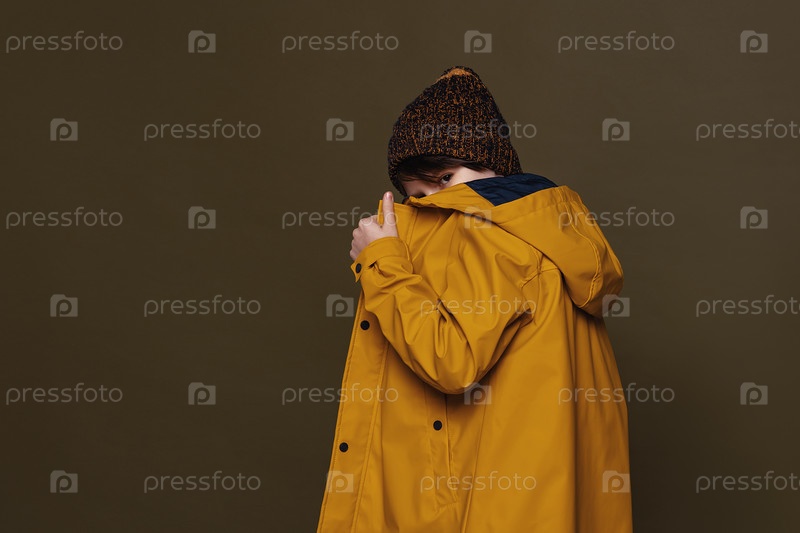 Портрет мальчика, позирующего в студии на зеленом фоне. Повседневный стиль. Стильная съемка в студии