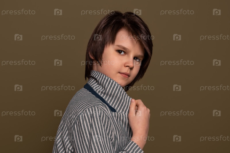 Портрет мальчика, позирующего в студии на зеленом фоне. Повседневный стиль. Стильная съемка в студии