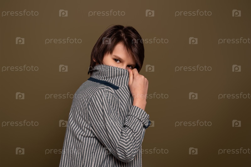 Портрет мальчика, позирующего в студии на зеленом фоне. Повседневный стиль. Стильная съемка в студии