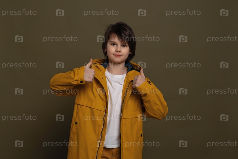 Счастливый маленький мальчик показывает палец вверх. Веселое выражение лица и жест победителя. Студийный снимок, зеленый фон
