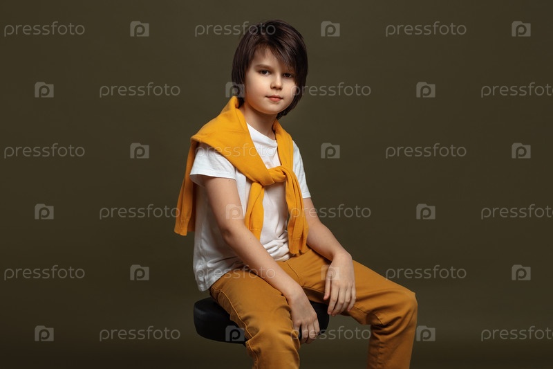Красивый молодой мальчик моды сидит на стуле в студии на зеленом фоне. Повседневный стиль. Стильная съемка в студии