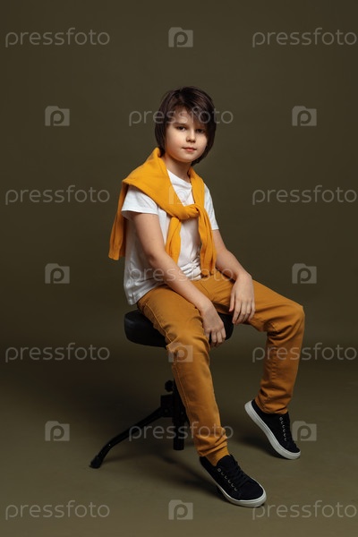 Красивый молодой мальчик моды сидит на стуле в студии на зеленом фоне. Повседневный стиль. Стильная съемка в студии