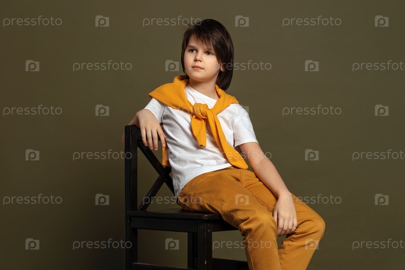 Красивый молодой мальчик моды сидит на стуле в студии на зеленом фоне. Повседневный стиль. Стильная съемка в студии