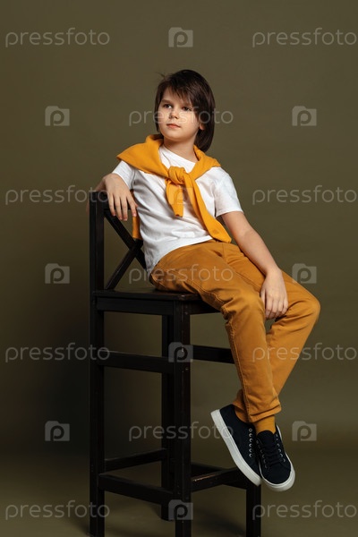 Красивый молодой мальчик моды сидит на стуле в студии на зеленом фоне. Повседневный стиль. Стильная съемка в студии