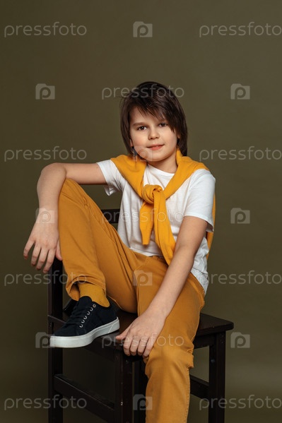 Красивый молодой мальчик моды сидит на стуле в студии на зеленом фоне. Повседневный стиль. Стильная съемка в студии