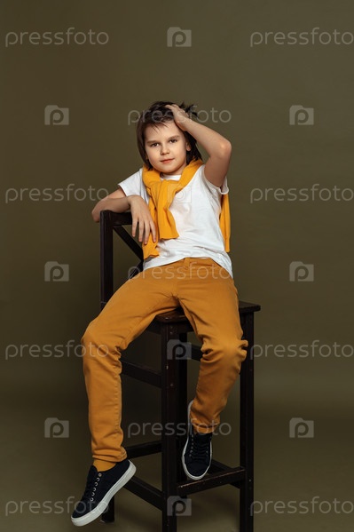 Красивый молодой мальчик моды сидит на стуле в студии на зеленом фоне. Повседневный стиль. Стильная съемка в студии
