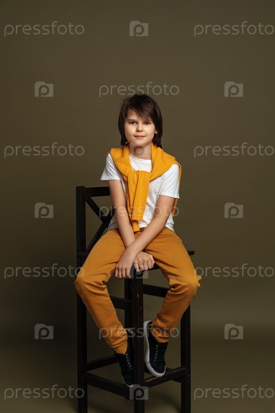 Красивый молодой мальчик моды сидит на стуле в студии на зеленом фоне. Повседневный стиль. Стильная съемка в студии