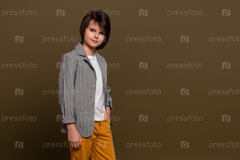 Портрет мальчика, позирующего в студии на зеленом фоне. Повседневный стиль. Стильная съемка в студии
