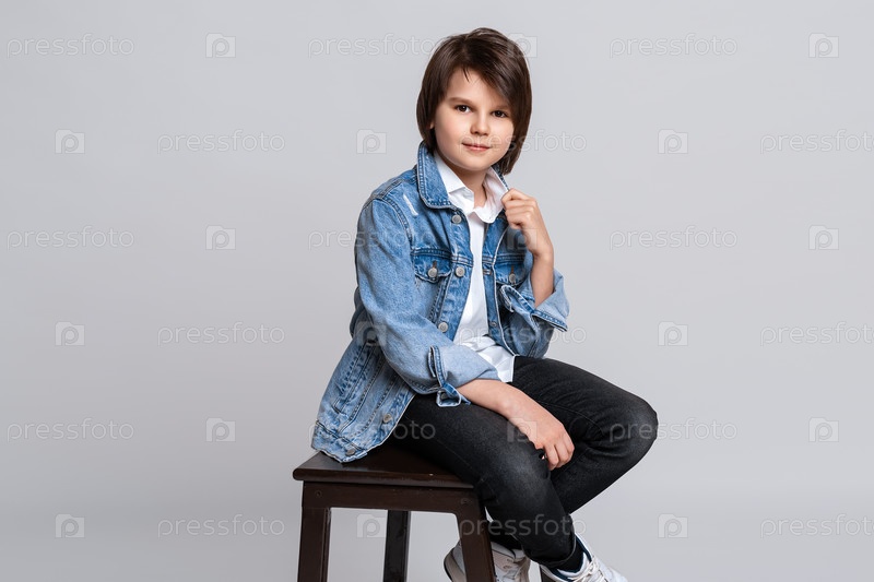 Красивый модный маленький мальчик в джинсовой куртке позирует в студии. Модельный тест. Концепция моды и людей. Место для рекламы