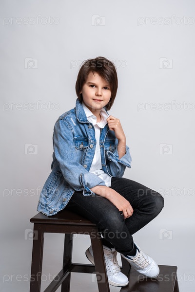 Красивый модный маленький мальчик в джинсовой куртке позирует в студии. Модельный тест. Концепция моды и людей. Место для рекламы