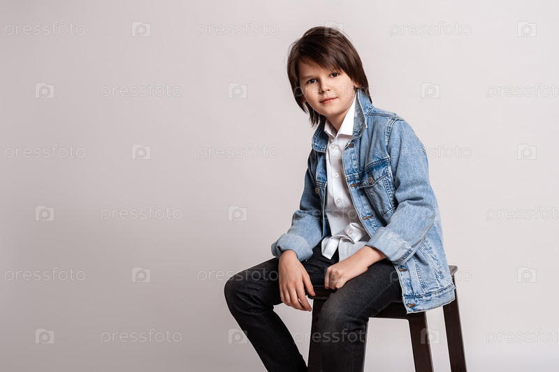 Красивый модный маленький мальчик в джинсовой куртке позирует в студии. Модельный тест. Концепция моды и людей. Место для рекламы