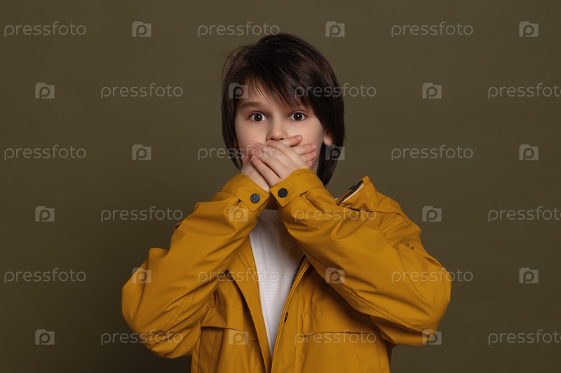 Испуганный маленький мальчик держит руки возле рта, стоя в ступоре на зеленом фоне. Истинные человеческие реакции и эмоции