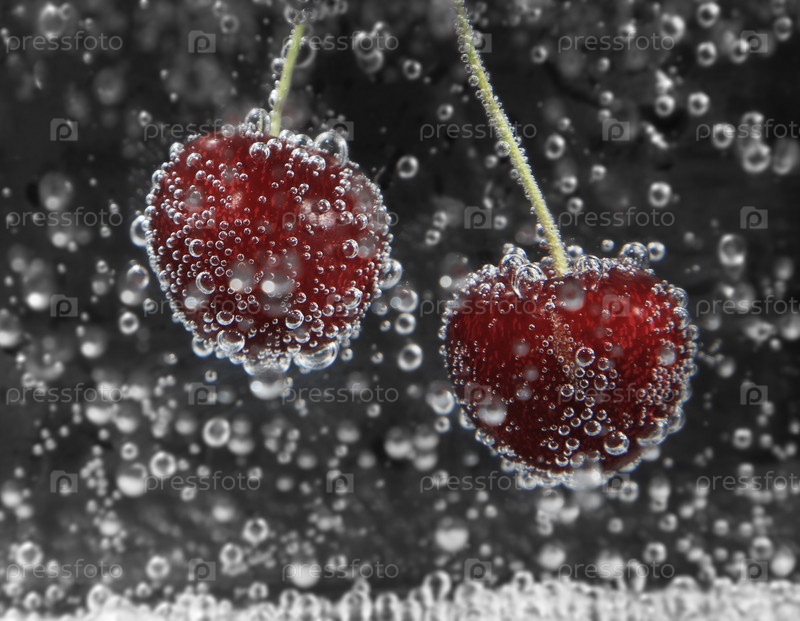 Вишня в воде с пузырьками крупным планом на темном фоне
