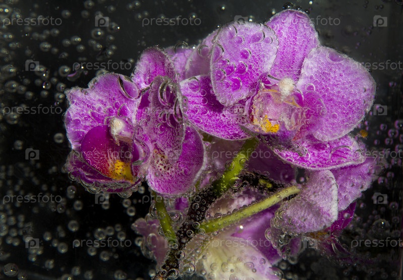 Орхидеи в газированной воде с пузырьками крупным планом на черном фоне. абстрактная композиция