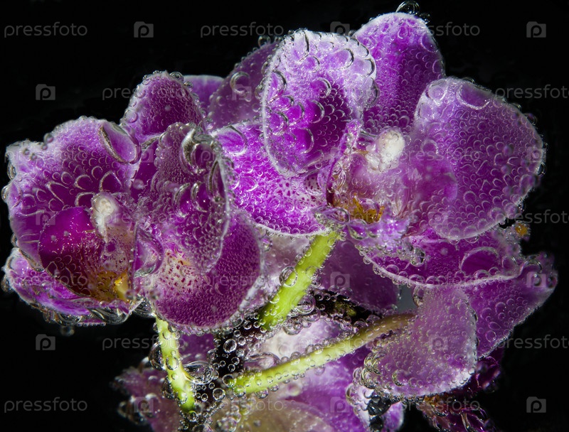 Орхидеи в газированной воде с пузырьками крупным планом на черном фоне. абстрактная композиция