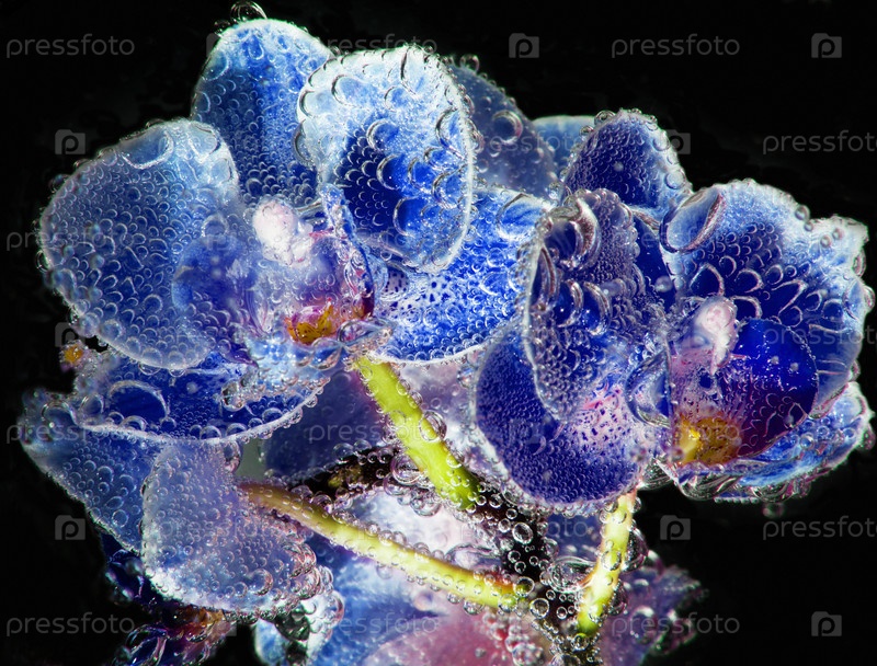 Орхидеи в газированной воде с пузырьками крупным планом на черном фоне. абстрактная композиция