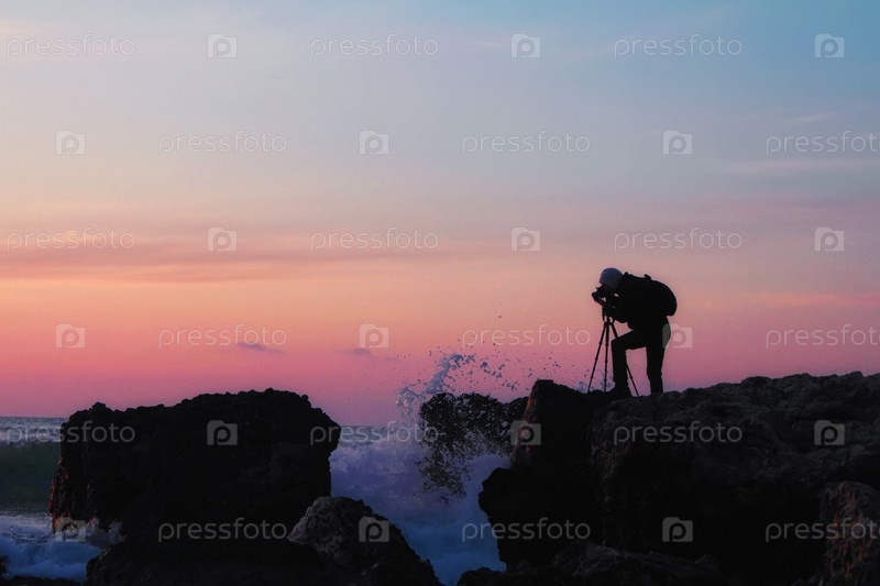 Силуэт фотографа с рюкзаком и штативом на фоне красивого заката