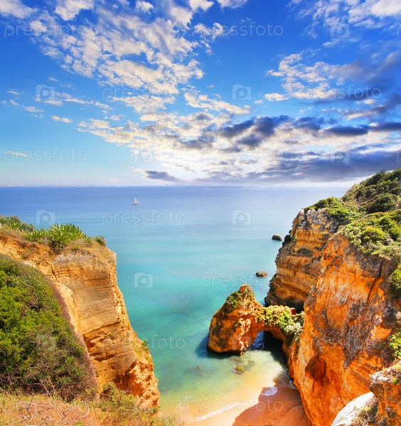 Скалистый пляж на закате, Лагос, Португалия. Счетчик света. Путешествия и бизнес фон