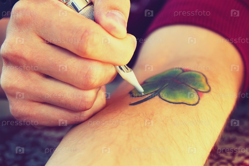 Татуировщик показывает процесс создания татуировки. четырехлистный клевер